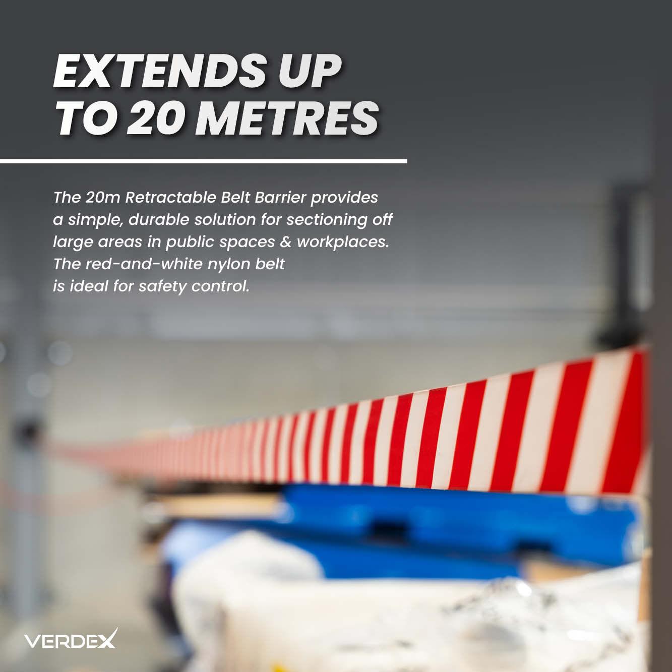 The 20m Retractable Belt Barrier – Red/White is a durable plastic unit designed for sectioning off large areas for safety or crowd control in public spaces and workplaces, featuring a 20-metre retractable belt.