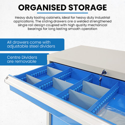 7 Drawer Industrial Tooling Cabinet is specifically designed to meet the demands of heavy-duty industrial applications, providing secure and organized storage for tools and equipment. Here's a breakdown of its features: