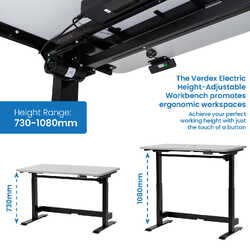 The Verdex Electric Height-Adjustable Workbenches are industrial-grade and designed to improve ergonomics by allowing users to switch between sitting and standing. They are guaranteed to improve productivity with quick adjustments. These Workbenches are suited to industries such as manufacturing, electronics, & labs etc. With a vast range of accessories available, these Workbenches are customisable for your benefit & convenience!