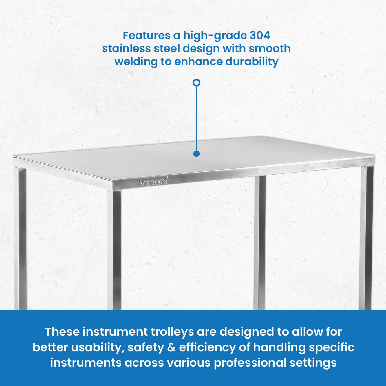 - Single Stainless Steel Instrument Trolley is designed to provide a sturdy and reliable solution for various applications, including medical facilities, laboratories, and food preparation areas