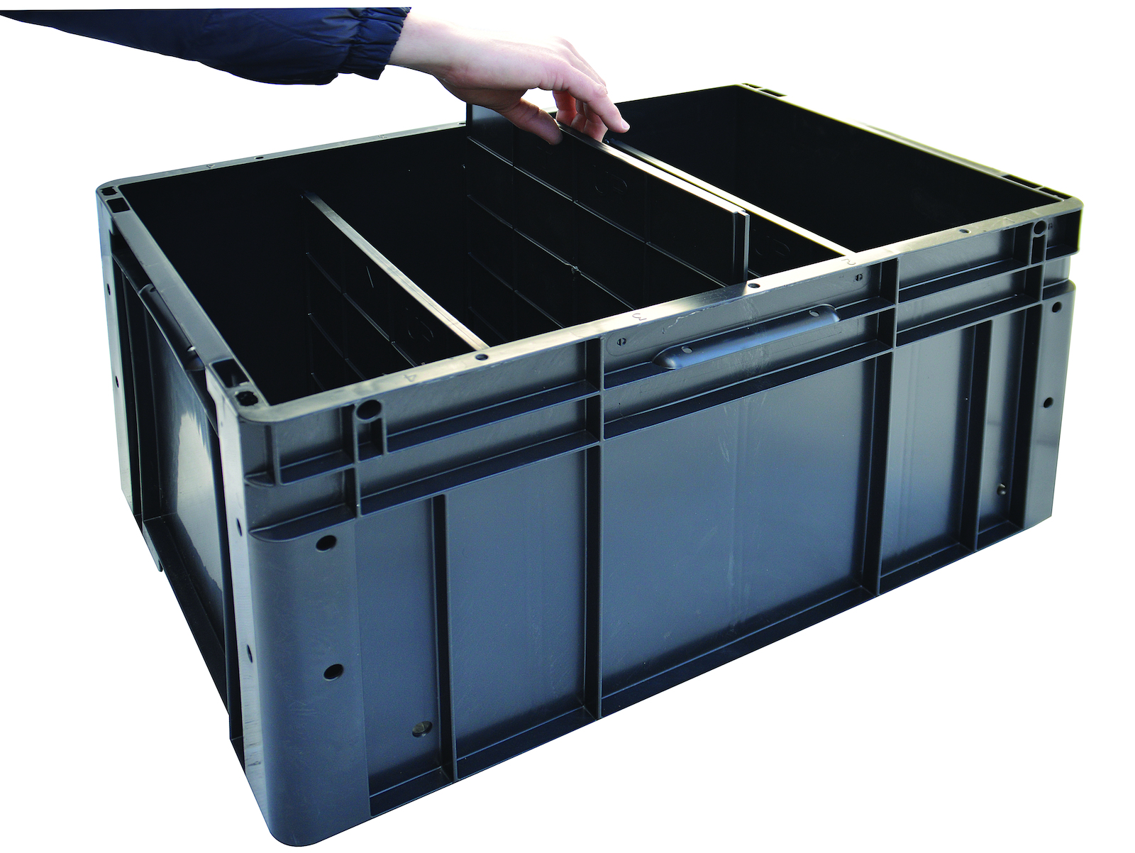 Introducing our Black Tote and Dividers, the ultimate solution for efficient and organized storage in industrial environments. Designed with functionality and durability in mind, this tote is perfect for use on conveyor or roller systems, thanks to its gridded base which minimizes noise when moving along rollers.