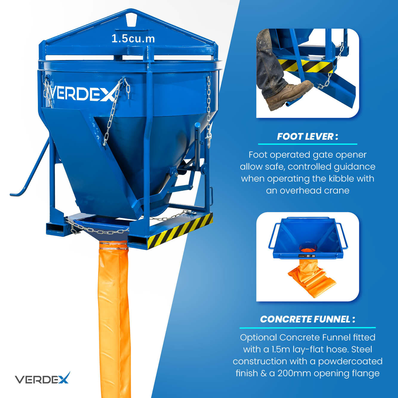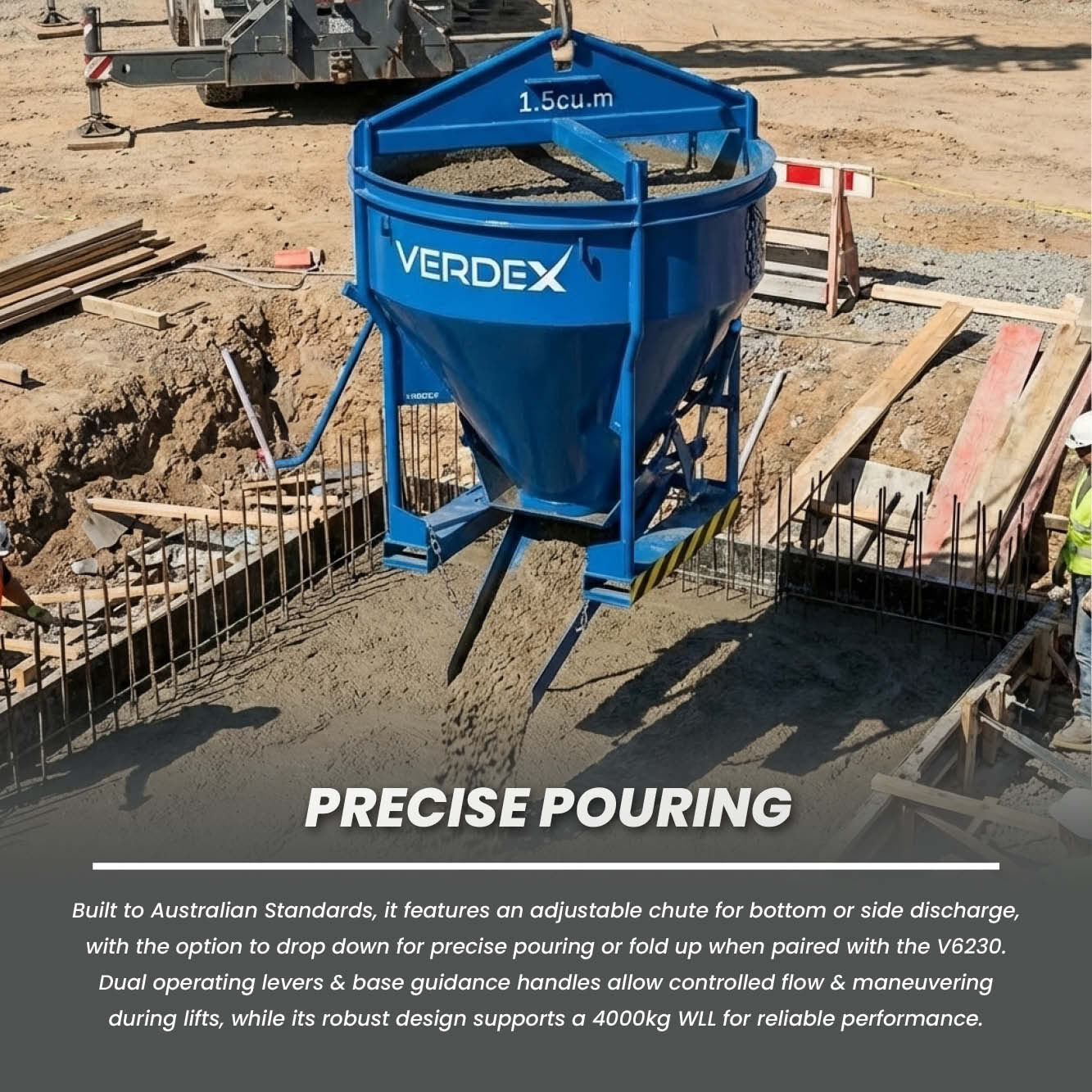 The Concrete Kibble (1.5 Cubic Metre) is a heavy-duty solution for safely transporting and placing concrete on construction, civil, and infrastructure sites. Built to Australian Standards, it features an adjustable chute for bottom or side discharge, with the option to drop down for precise pouring or fold up when paired with the V6230. Dual operating levers and base guidance handles allow controlled flow and maneuvering during lifts, while its lightweight yet robust design supports a 4000kg WLL for reliable performance.