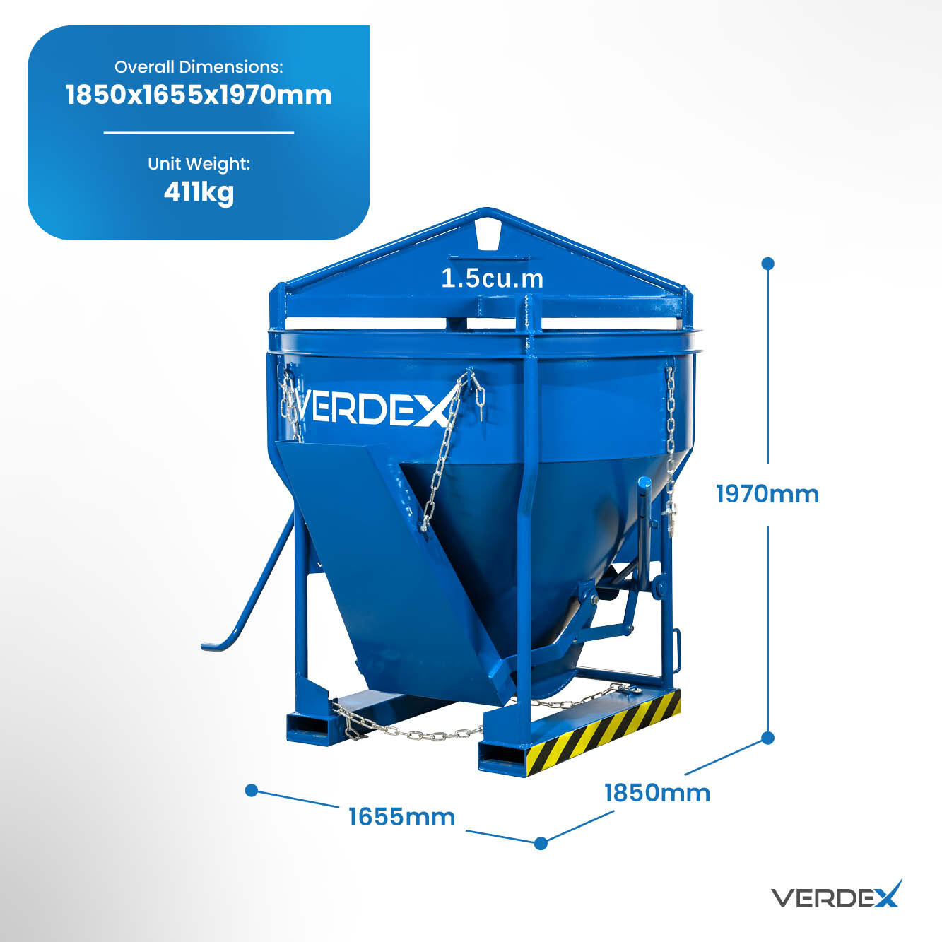 Safety Blue Enamel Finish: The kibble features a safety blue enamel finish, enhancing visibility and safety in the work environment. This ensures heightened awareness and adherence to safety protocols during concrete pouring operations.