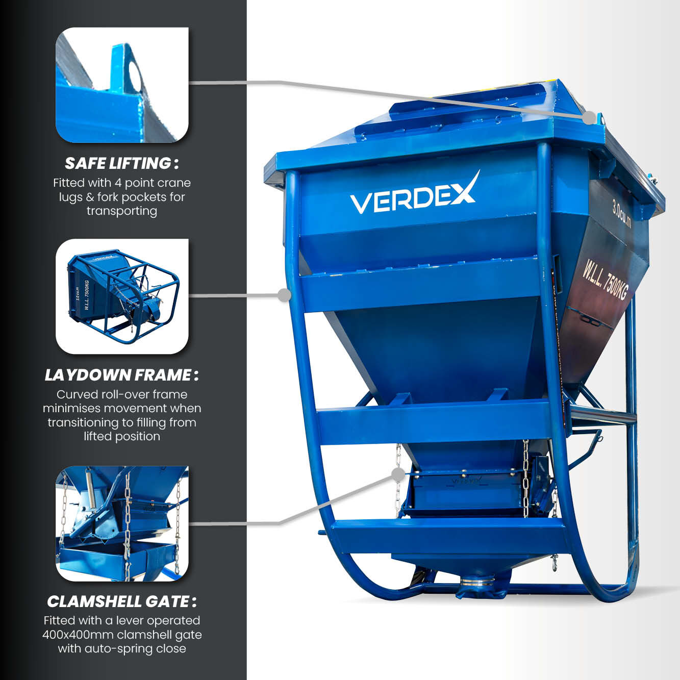 Clamshell Gate with Auto Close: Equipped with a lever-operated 400mm x 400mm clamshell gate with auto close feature, the kibble ensures controlled and precise discharge of concrete, minimizing waste and maximizing productivity.