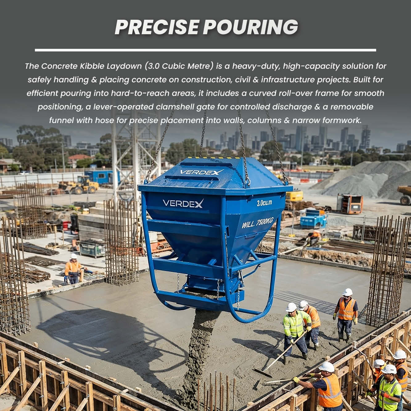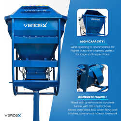 Removable Concrete Funnel: The kibble includes a removable concrete funnel with a 2-meter lay-flat hose, enabling controlled flow when filling wall cavities, columns, or narrow formwork. This feature enhances accuracy and efficiency during concrete pouring tasks.