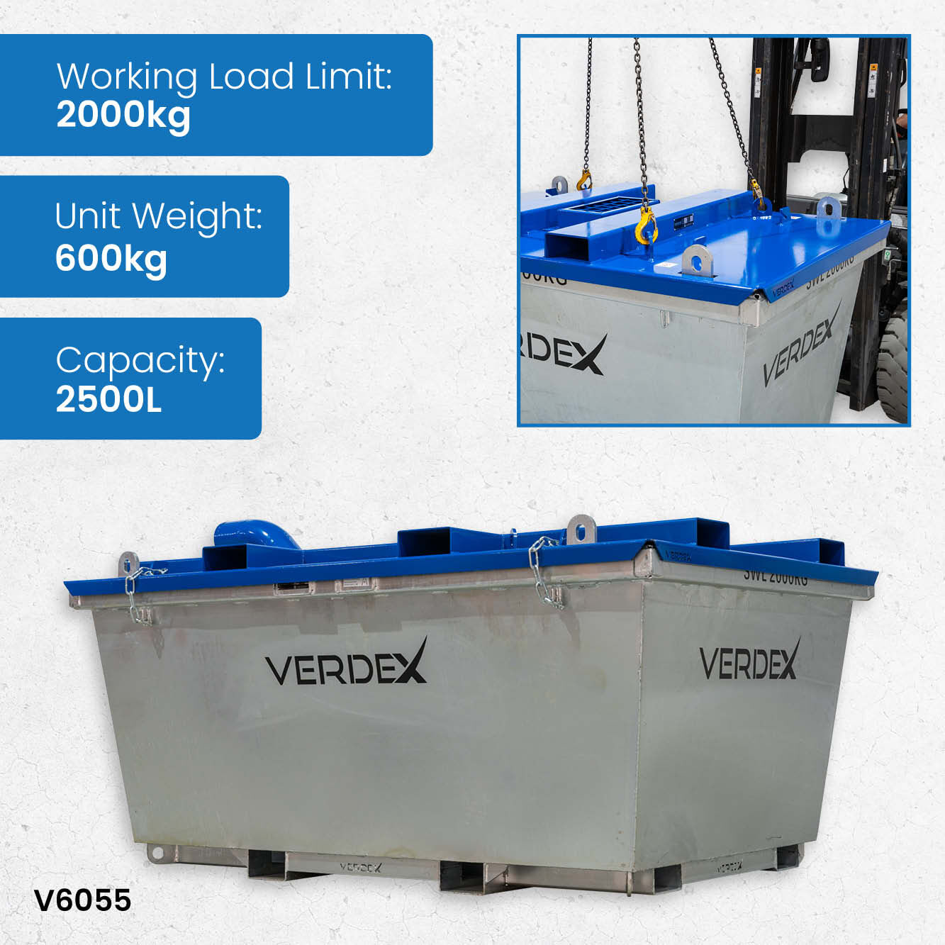 | V6055 | 2000kg | 2.5cu.m | 2330x1545x1316mm | 600kg |