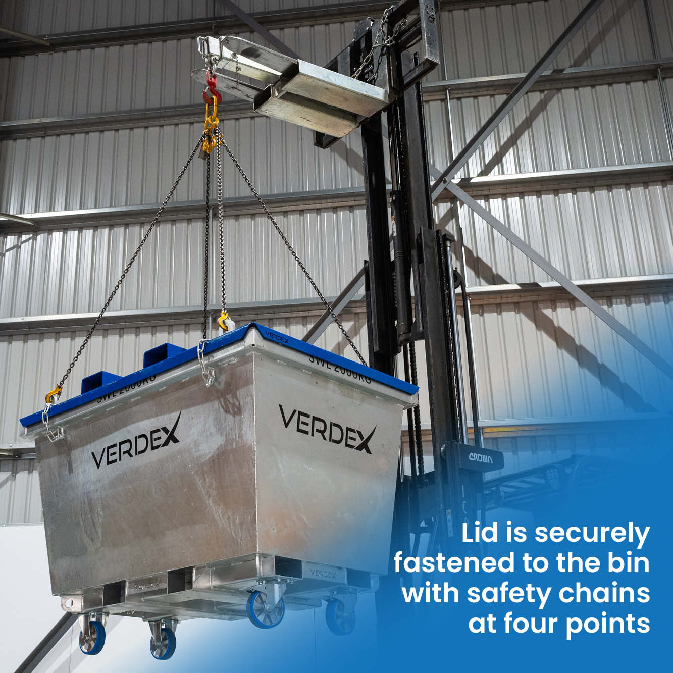 Reliable Containment: The lid is secured by four safety chains, forming a tight seal that minimises spills and prevents leakage.