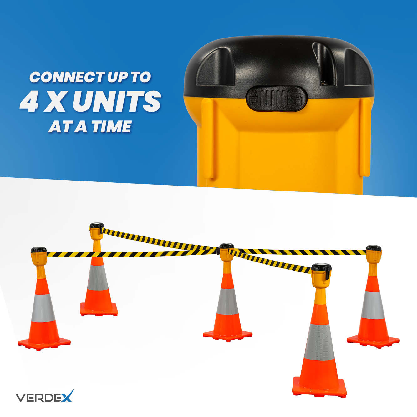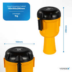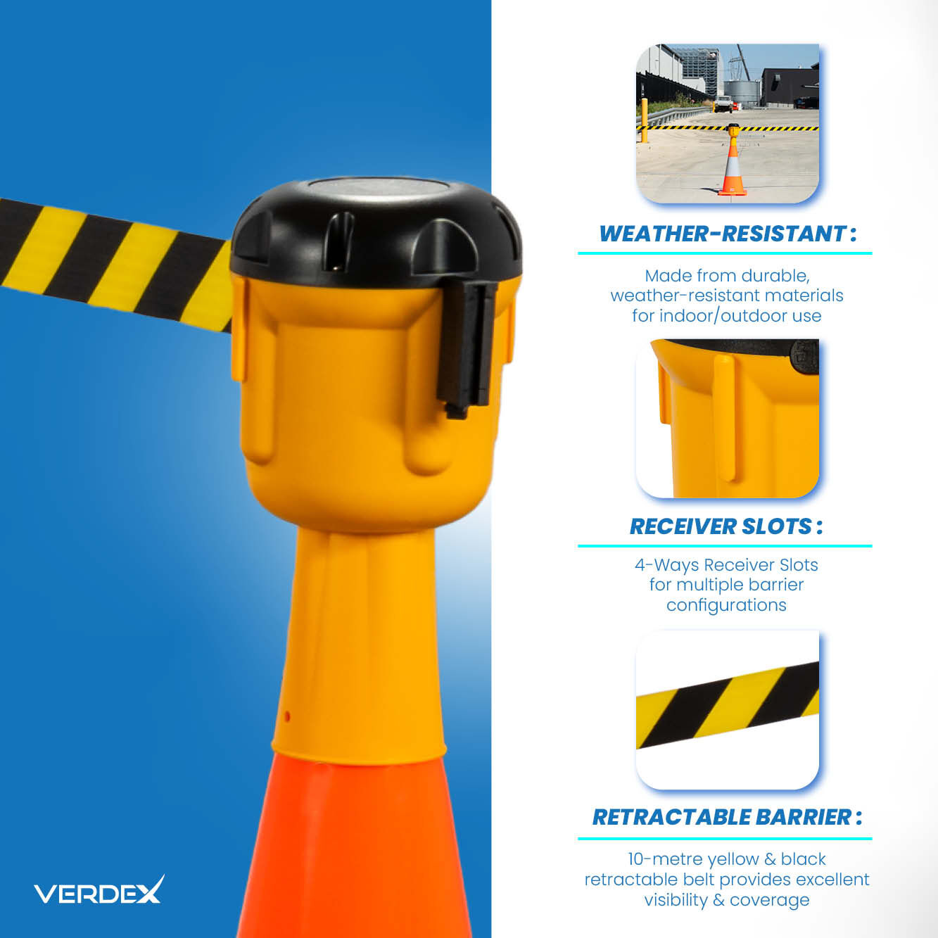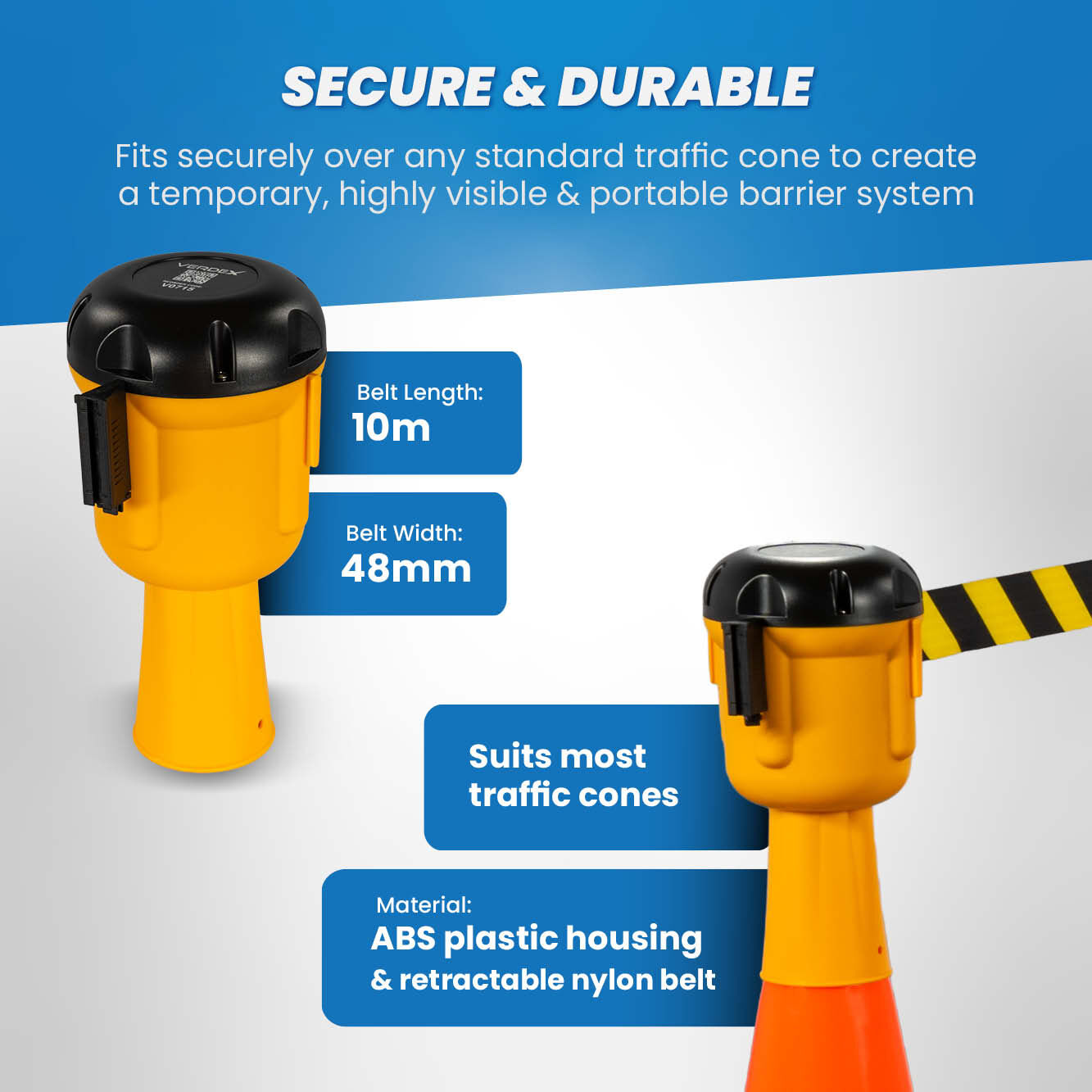 The Cone Top 10m Retractable Barrier – Black/Yellow offers a quick and reliable solution for marking off restricted or hazardous areas. Designed to fit directly over standard traffic cones, it instantly converts them into a portable, high-visibility barrier system. The yellow and black retractable belt extends up to 10 metres, providing clear coverage and visibility in busy environments. Built from tough, weather-resistant materials, it features a secure tape lock and braking system to prevent accidental release. Suitable for construction sites, car parks, events, and public venues, it can also be paired with another unit to form an effective pedestrian barrier.