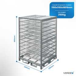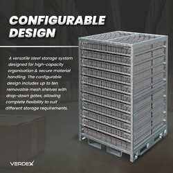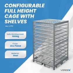 The Configurable Full Height Cage with Shelves provides a reliable and adaptable solution for secure, high-capacity storage and material handling. Constructed from heavy-duty steel with a zinc-plated finish, it’s built to resist corrosion and perform in demanding industrial environments. Featuring up to ten removable mesh shelves with drop-down gates, the design can be configured to suit various storage setups. With a Safe Working Load (SWL) of 1000kg, four-way forklift access, and optional castors or floor locks for added mobility, it’s a smart choice for warehouses, factories, and logistics facilities.