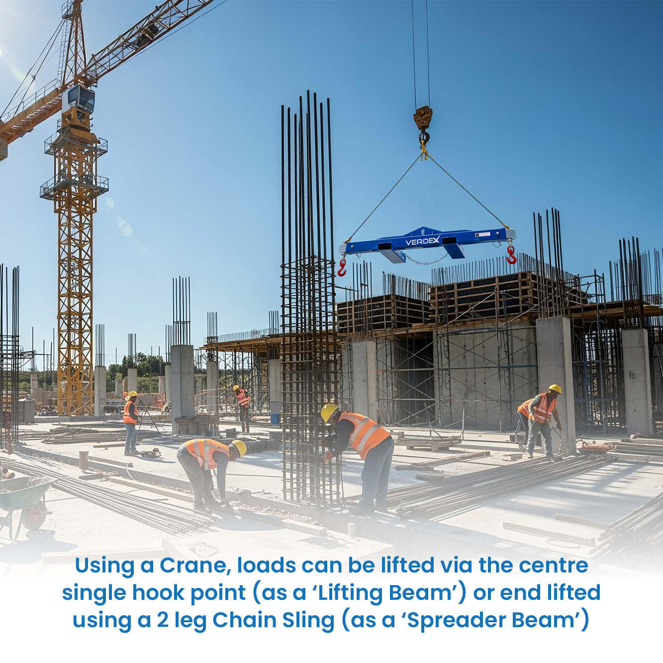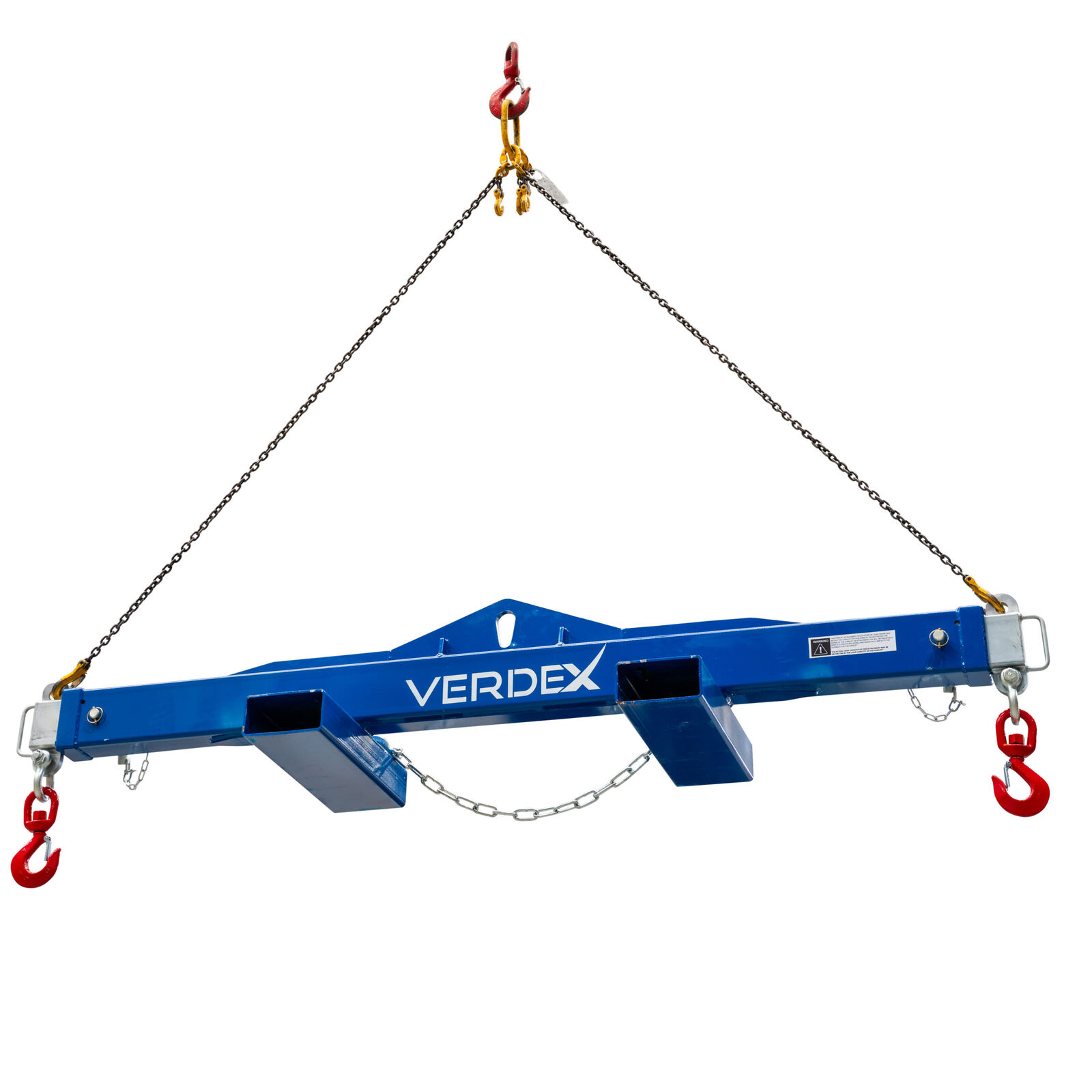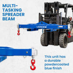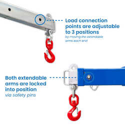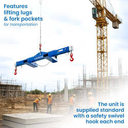 The Spreader Beam features adjustable load connection points, with extendable arms that can be set to three positions and locked into place with safety pins. Each end is equipped with a safety swivel hook for added security during lifting operations.