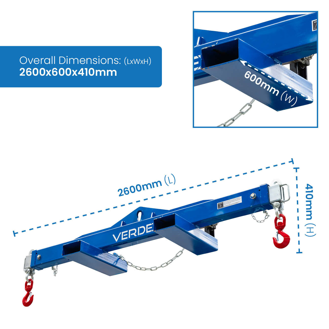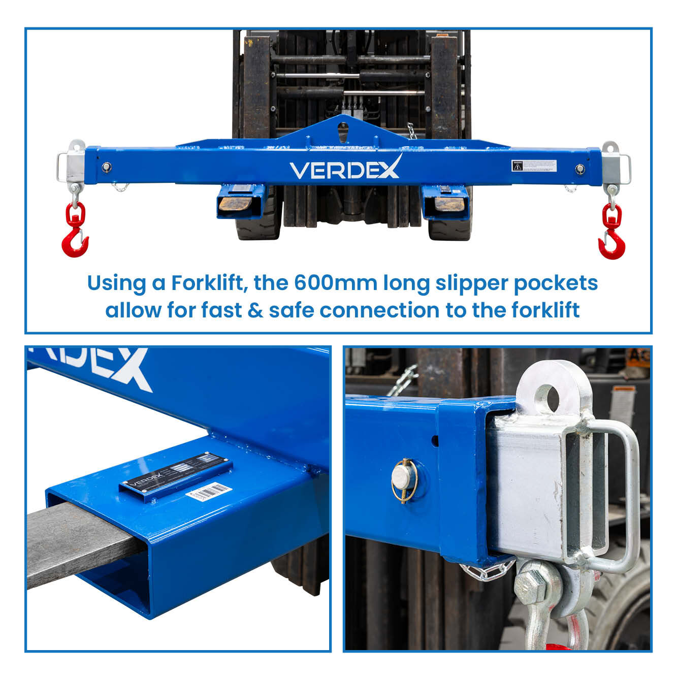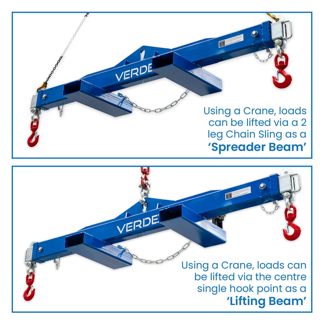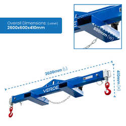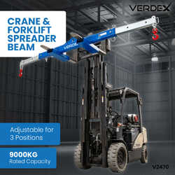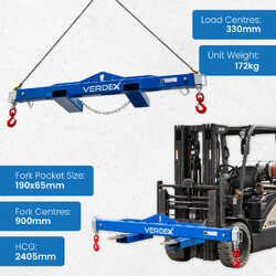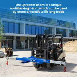 The type V2470 Spreader Beam is a unique multitasking Beam which can be used by Crane or Forklift to lift long loads. Using a Crane, loads can be lifted via the centre single hook point (as a ‘Lifting Beam’), or end lifted using a 2 leg Chain Sling (as a ‘Spreader Beam’). If lifting by forklift, the 600mm long slipper pockets allow for fast and safe connection to the truck. The Spreader Beam load connection points are adjustable to 3 positions by moving the extendable arms each end. Both extendable arms are locked into position via safety pins. The unit is supplied standard with a safety swivel hook on each end. The extendable arms are zinc plated with the main body painted in blue.