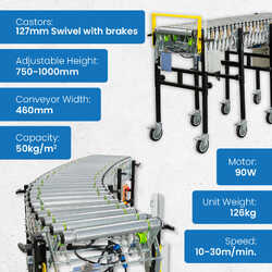 The Electric Expandable Conveyor with Sensor Control is built to streamline loading and unloading operations across warehouses, freight depots, and logistics facilities. Offering a 50kg per metre load rating, height adjustability, and the option to link up to four units, it ensures easy handling of cartons, boxes, parcels, and more. The included Photo Eye Sensor Kit enables automatic stop/start control, enhancing both workplace safety and operational efficiency.