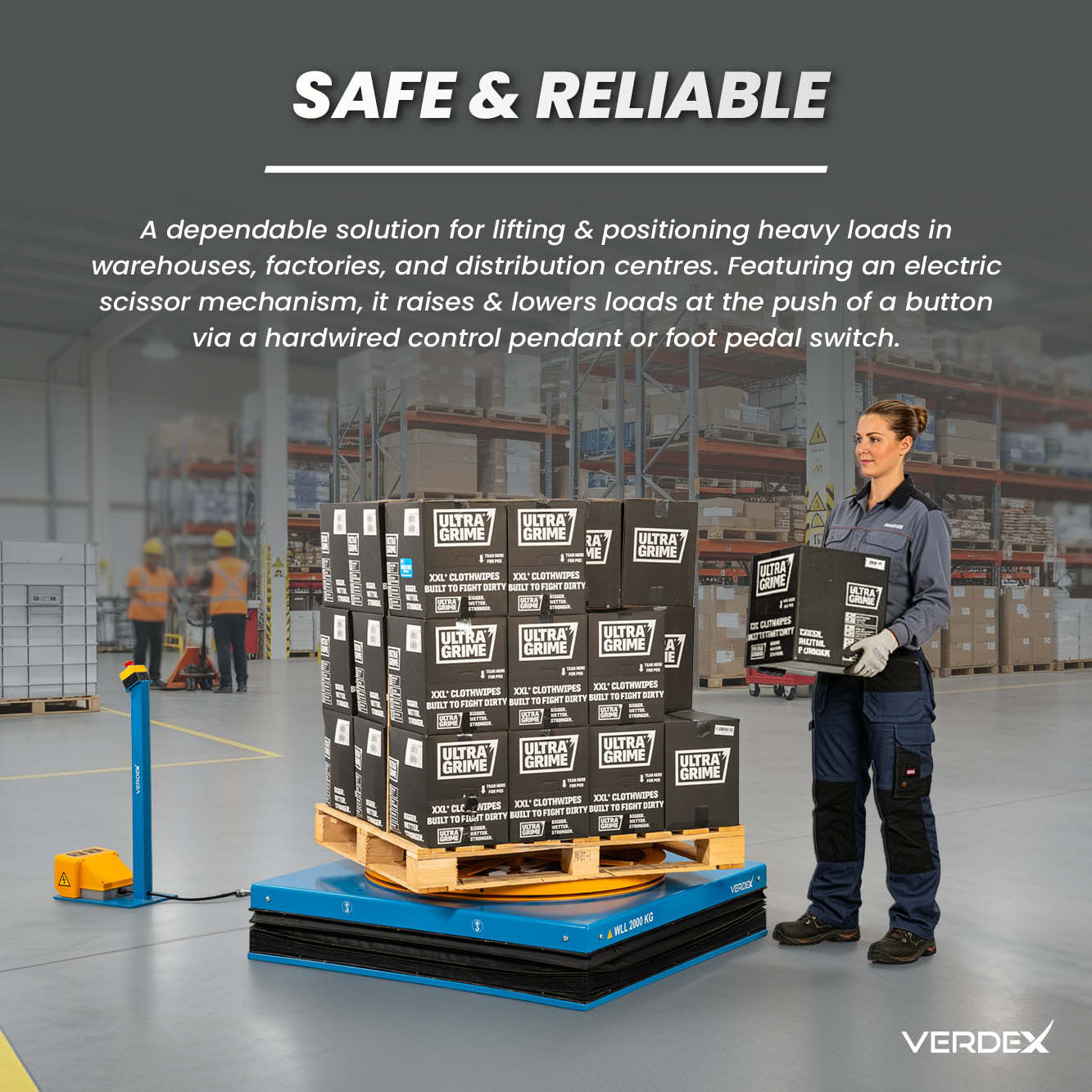 The Electric Single Lift Table – 2000kg makes lifting and positioning heavy items easy and safe. It is specifically designed to suit Australian standard pallets and uses a strong electric scissor design to smoothly raise and lower loads with a hardwired control pendant or foot pedal switch. Built from durable, powder coated steel, the table is designed to handle tough working conditions. A safety curtain under the platform helps prevent accidents during operation. Suitable for both floor-mounted and in-ground setups, it also includes removable lifting eyes for quick installation and maintenance. This lift table is ideal for warehouses and manufacturing facilities needing reliable and efficient material handling.