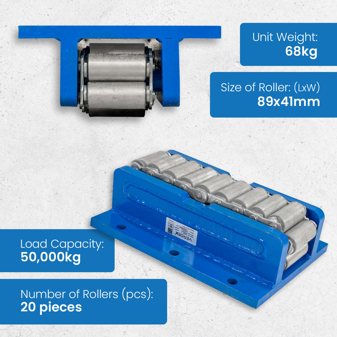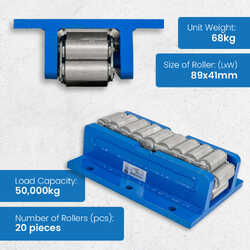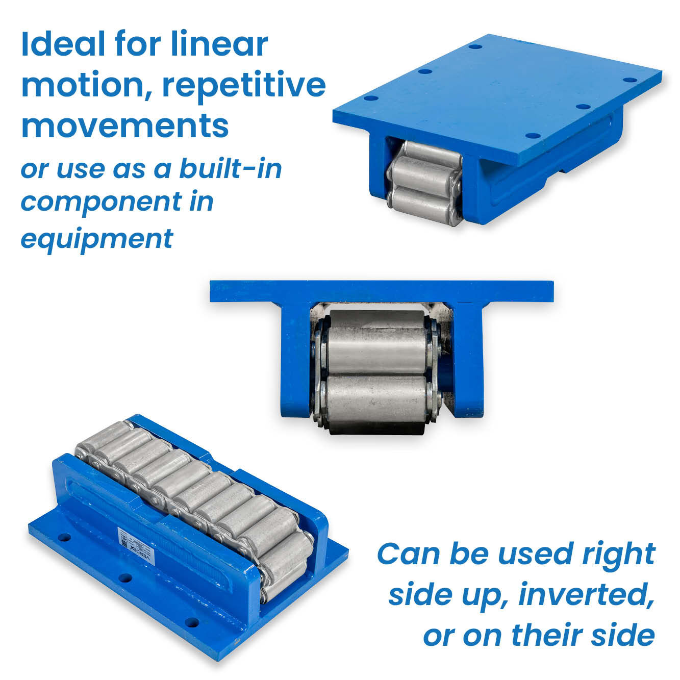 This heavy-duty skate is equipped with 20 durable rollers and a fixed hole pattern for secure bolt-mounting. It can operate upright, inverted, or on its side, making it ideal for repetitive linear motion or permanent integration into equipment. With a 50-tonne capacity, it delivers long-lasting performance in tough environments.