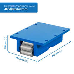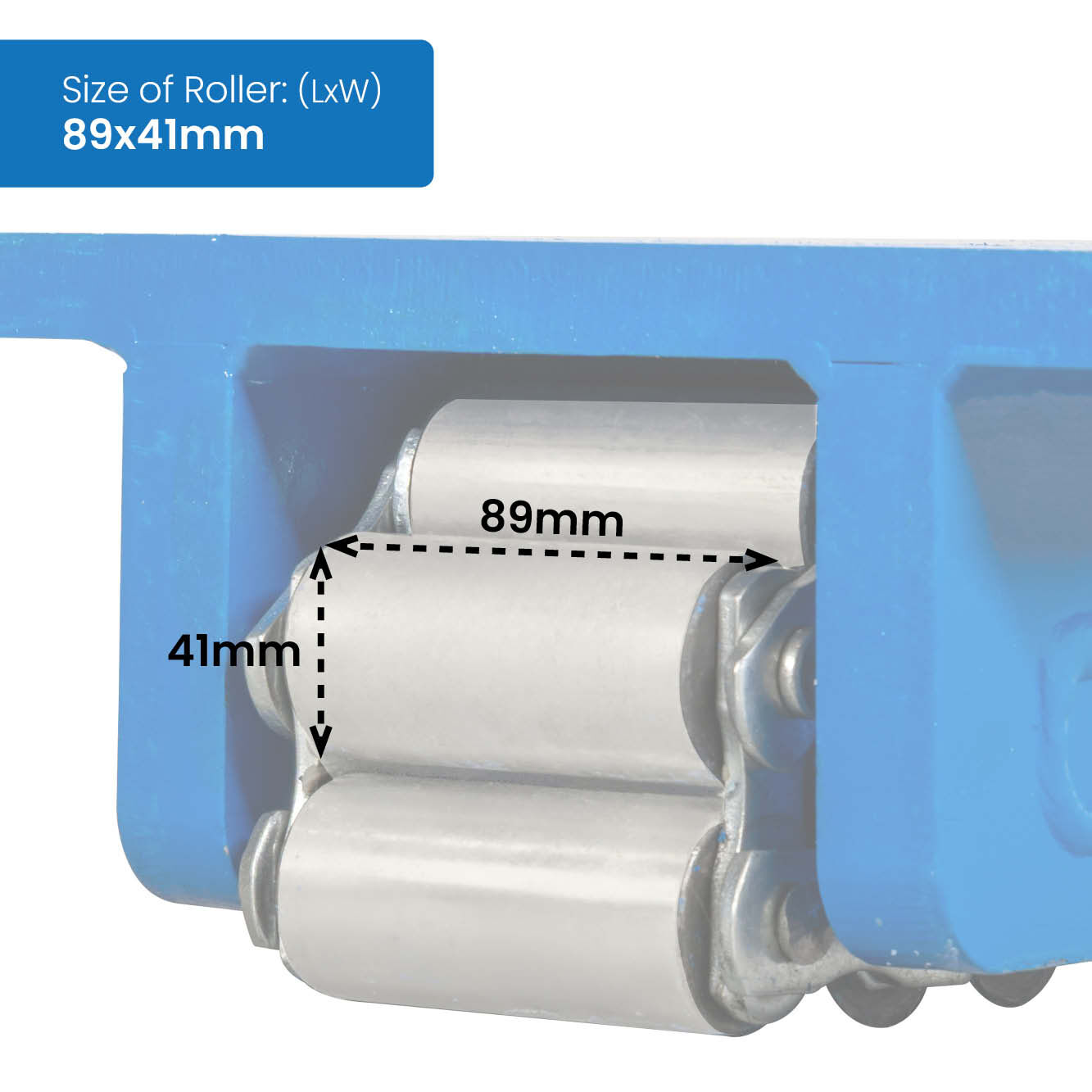 The skate measures 417mm x 305mm x 140mm and weighs 68kg. Each roller is 41mm in diameter and 89mm long, built to handle extreme loads with ease and reliability.