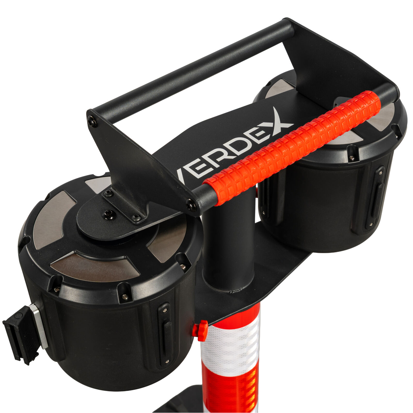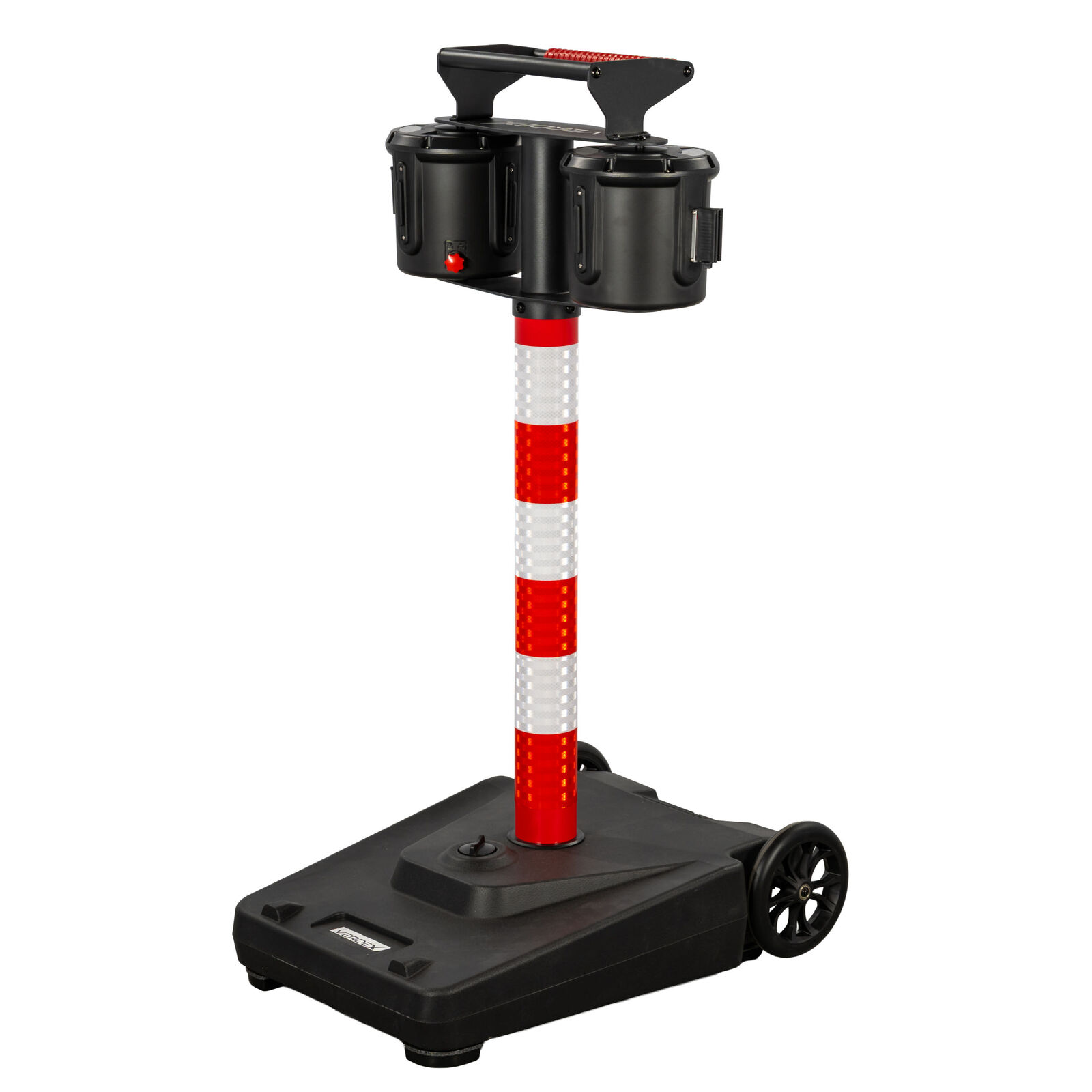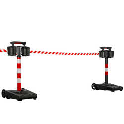The Mobile Retractable 20m Belt Barrier offers a practical solution for managing access in airports, stadiums, warehouses, factories, parking areas, and other high-traffic environments where extended safety barriers are needed. Constructed from durable steel with a black powder-coated finish, it is equipped with two transport wheels, a base that can be water-filled for extra stability, and a highly visible 20m red-and-white striped belt. Dual 360-degree swivel belt units allow flexible deployment in a straight line, at right angles, or at varying offsets.