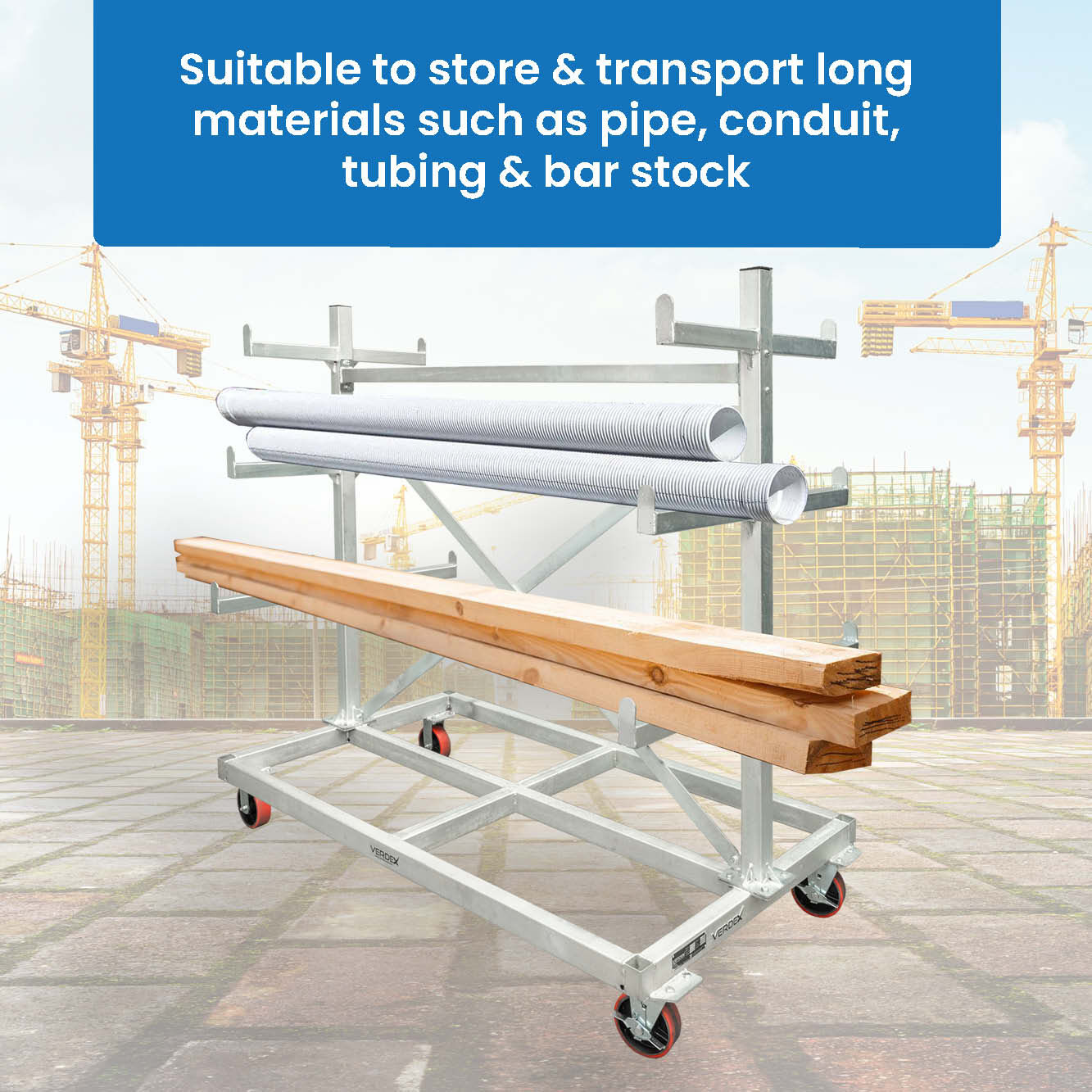 The M1280 Pipe Trolley is designed to safely store and transport long length materials such as pipe and conduit on site. These mobile storage solutions increase worker productivity by keeping materials organised and close to work areas.