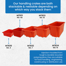 Our handling crates can stack or nest depending on which way around they are stored. Injection moulded from tough, durable, UV resistant Polypropylene they are suitable for food handling, engineering, warehousing or distribution