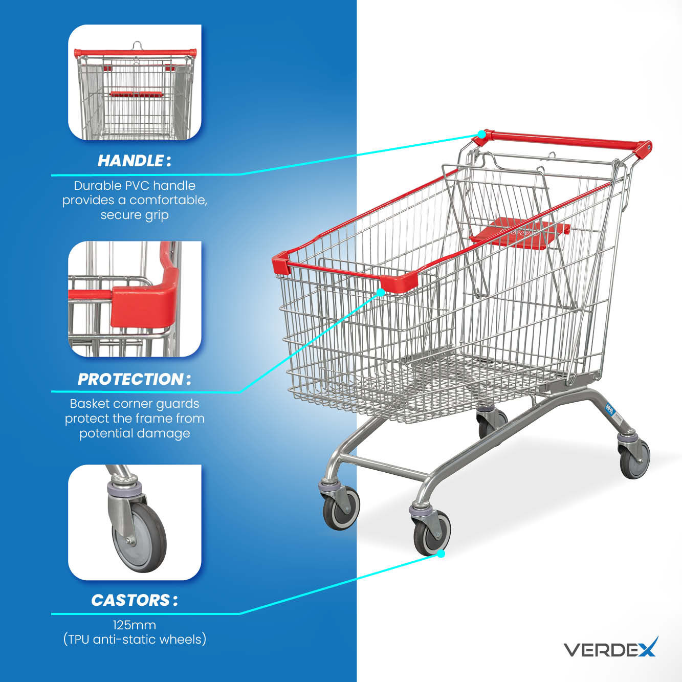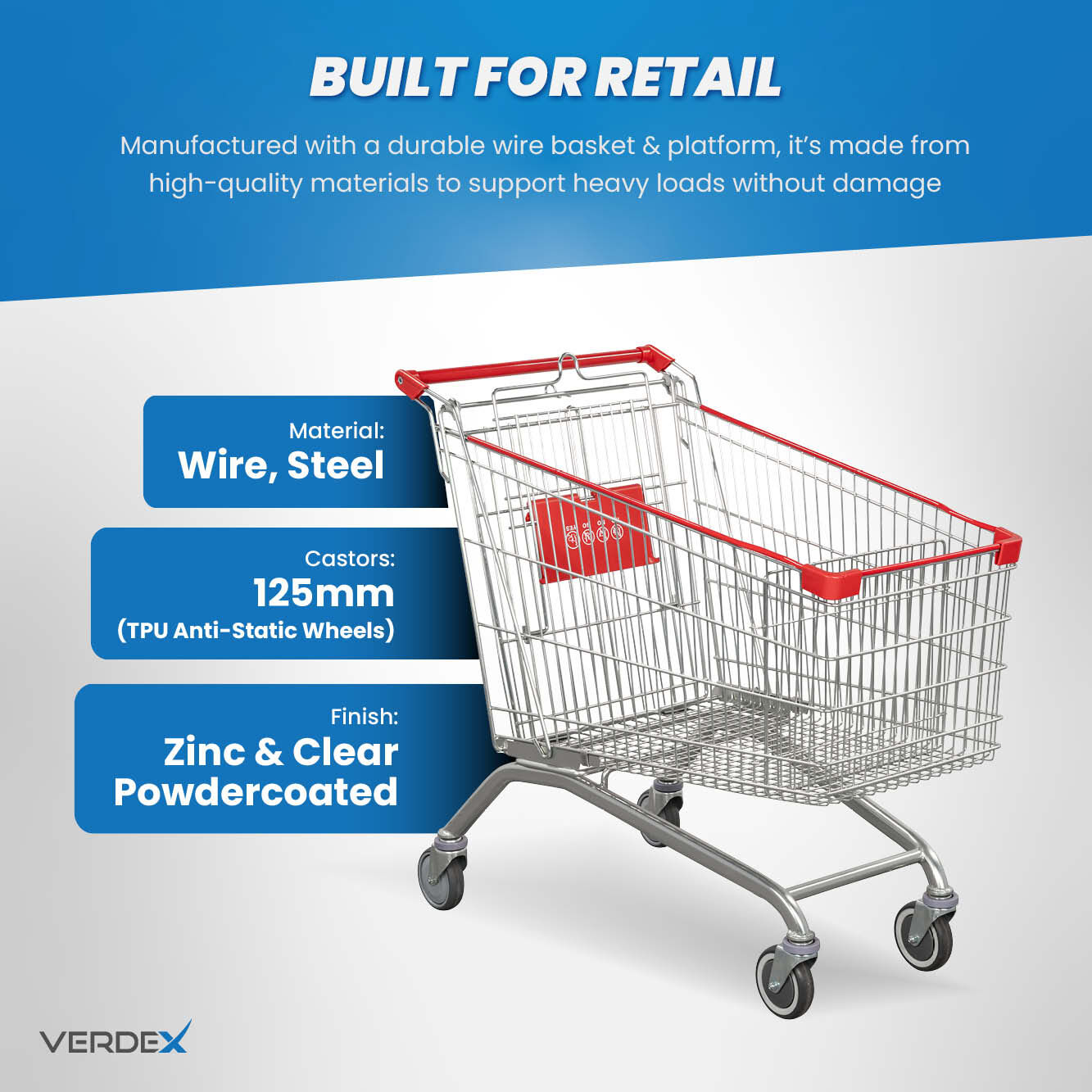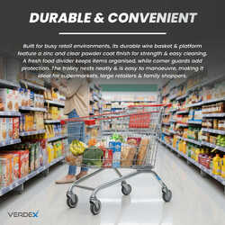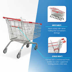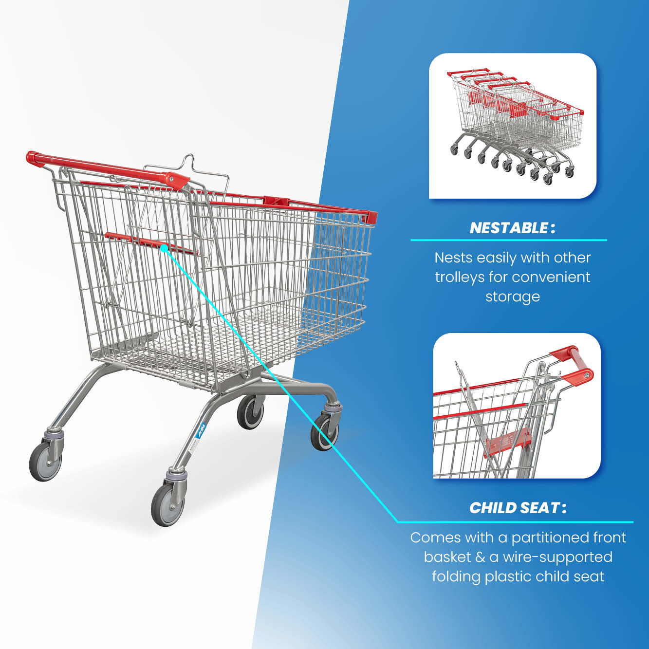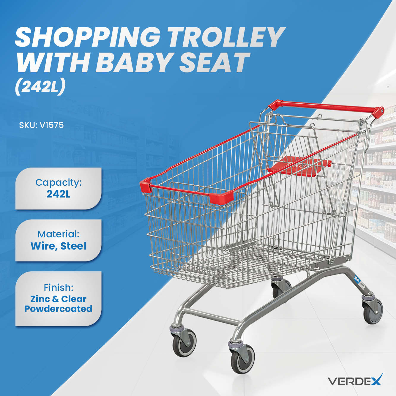 The Shopping Trolley with Baby Seat (242L) is a high-capacity retail trolley built for supermarket and commercial use. Constructed with a strong wire basket and reinforced platform, it’s made from quality materials designed to handle heavy loads with ease. The zinc and clear powder-coated finish ensures long-term durability and low maintenance. Featuring a fresh food divider helps keep groceries neatly separated. Designed for practicality, it nests smoothly with other trolleys, includes protective corner guards, and remains easy to manoeuvre — making it ideal for supermarkets, cash-and-carry outlets, and large retail stores serving family shoppers.