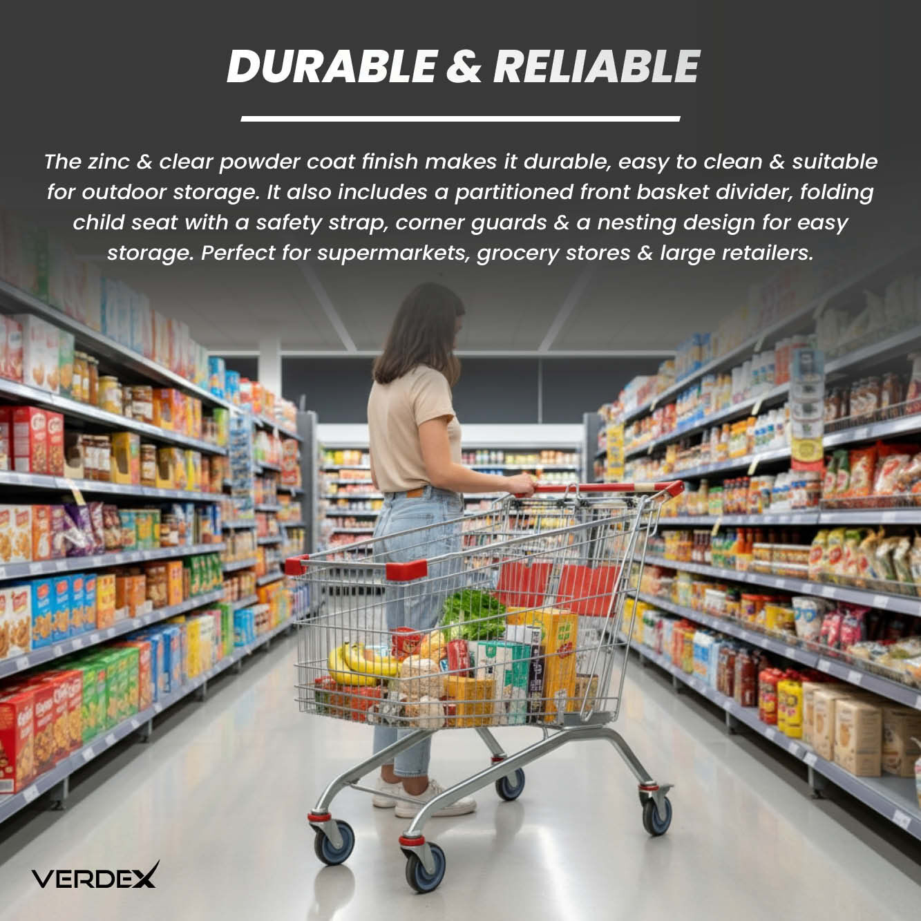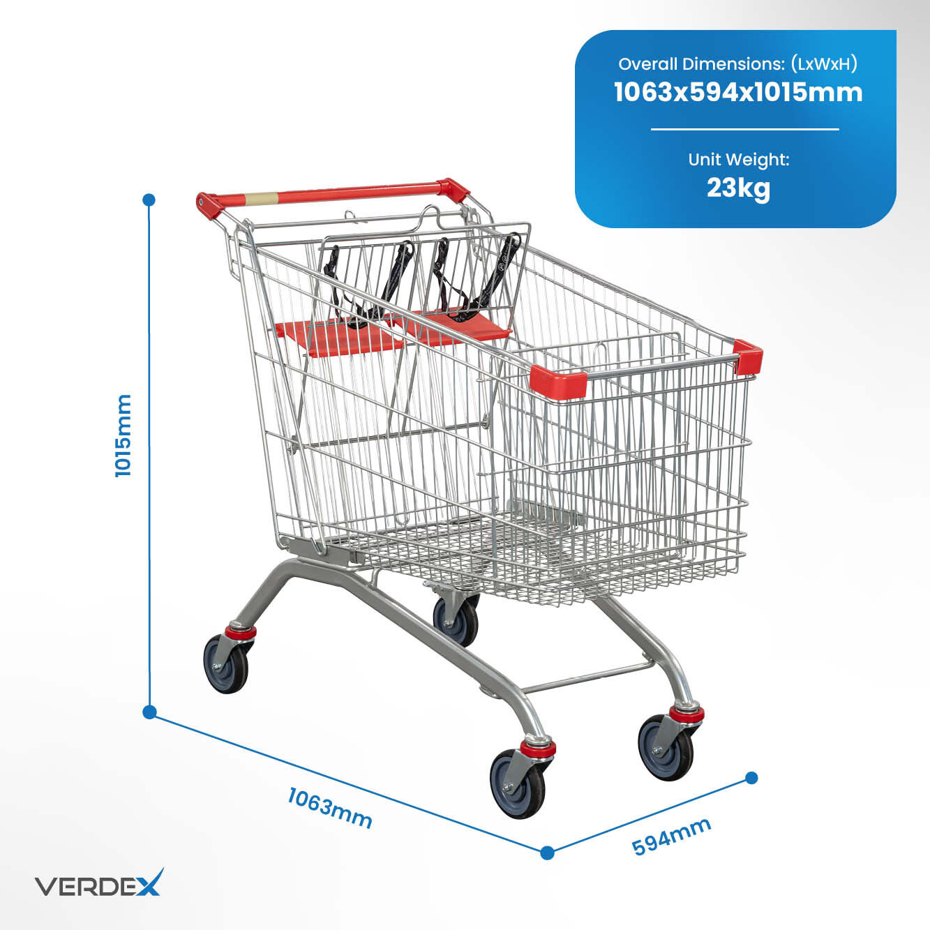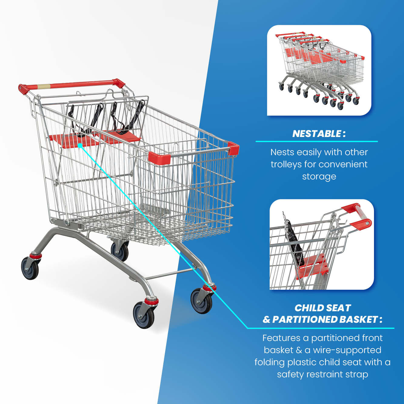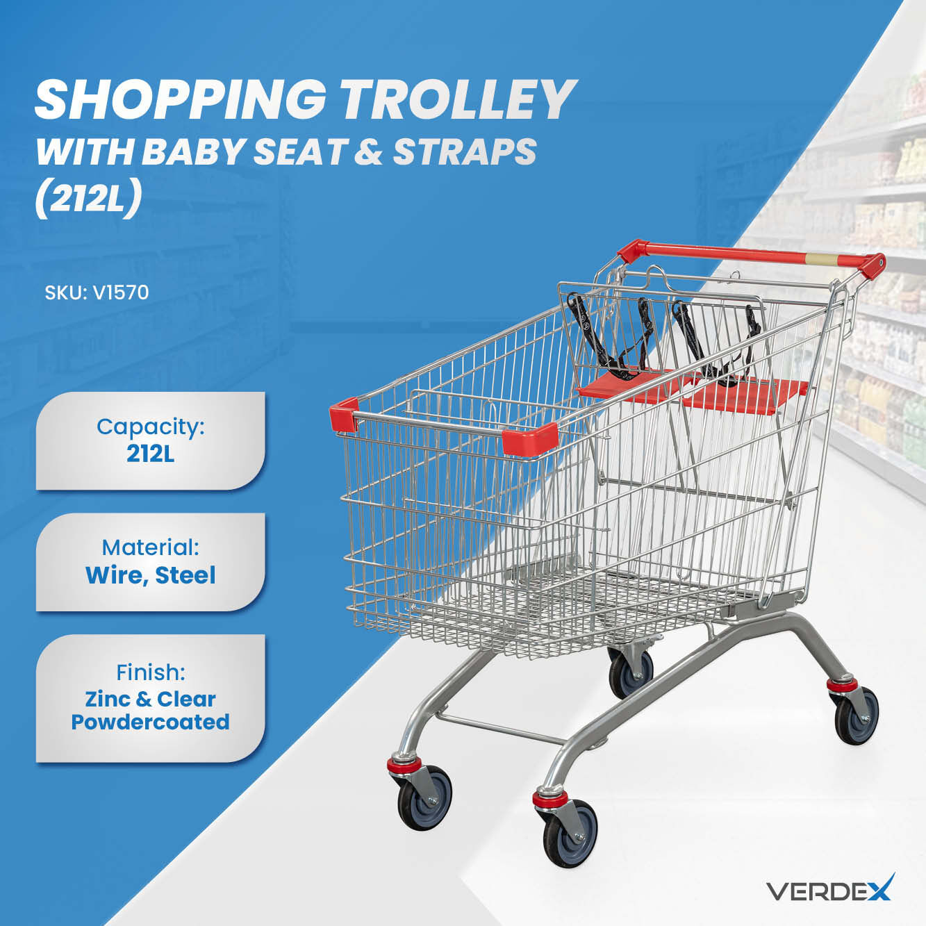 The Shopping Trolley with Baby Seat & Straps (212L) is a strong and reliable choice for supermarkets, grocery stores, and large retailers. Made from durable steel with a zinc and clear powder coated finish, it’s built to handle heavy loads while staying easy to clean and maintain. The trolley features a front basket divider, foldable child seat with safety strap, and corner guards for added protection. Its nesting design allows easy storage, making it a practical solution for busy retail environments.