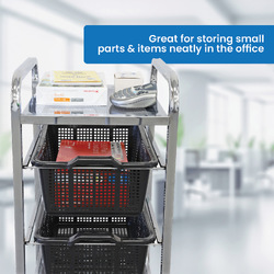The Triple Shelf Basket Trolley offers convenient storage for small parts and items in office settings. Here are its features and specifications: