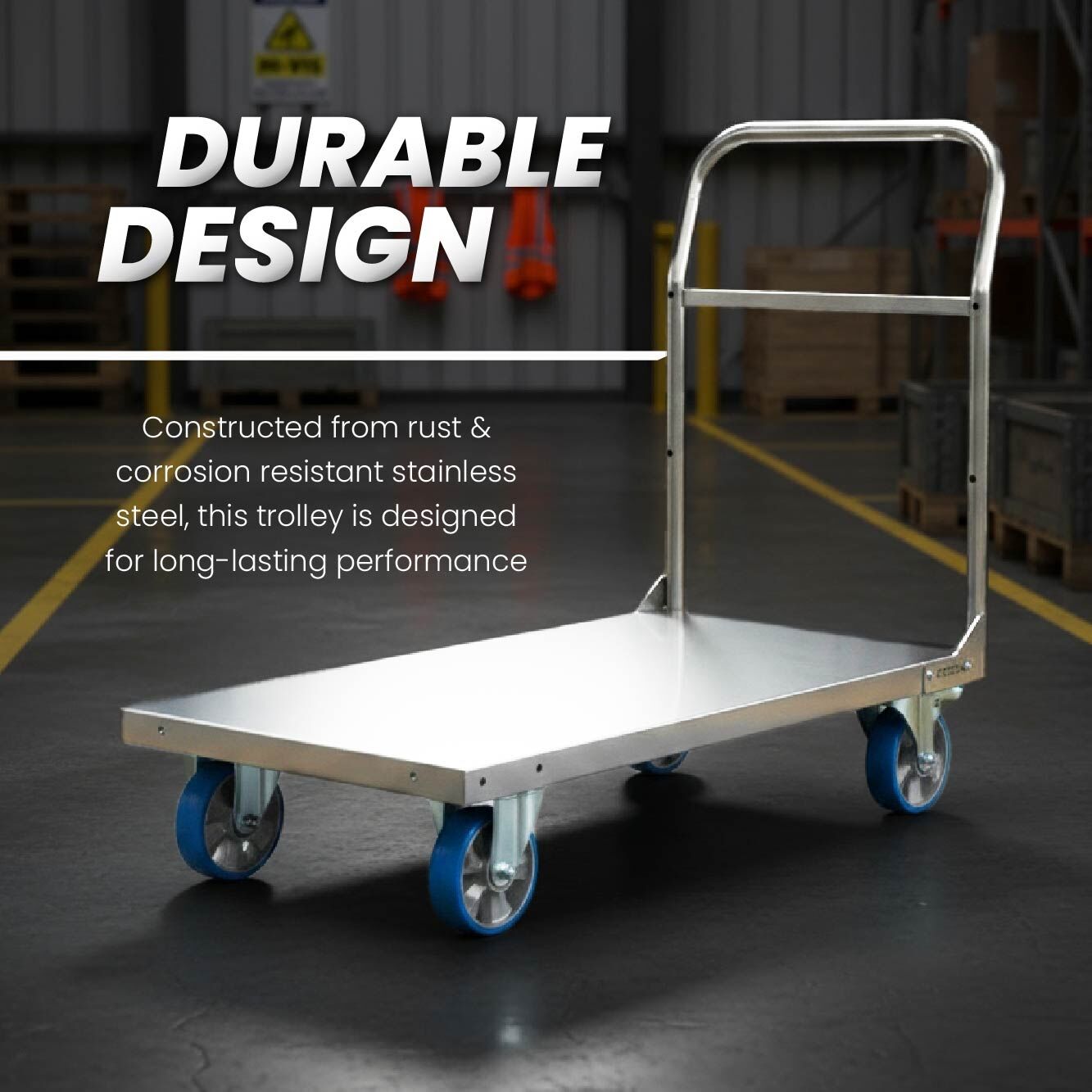The Stainless Steel Platform Trolley offers a robust and practical transport solution for busy commercial environments, including food processing, pharmaceutical and health care industries. Designed to handle loads up to 550kg, its large platform easily accommodates trays, baskets, and other supplies. Made from high-quality 304 stainless steel, it resists rust and corrosion for long service life. Its wheels allow smooth movement on multiple surfaces, while the foldable handle makes storage simple and efficient.